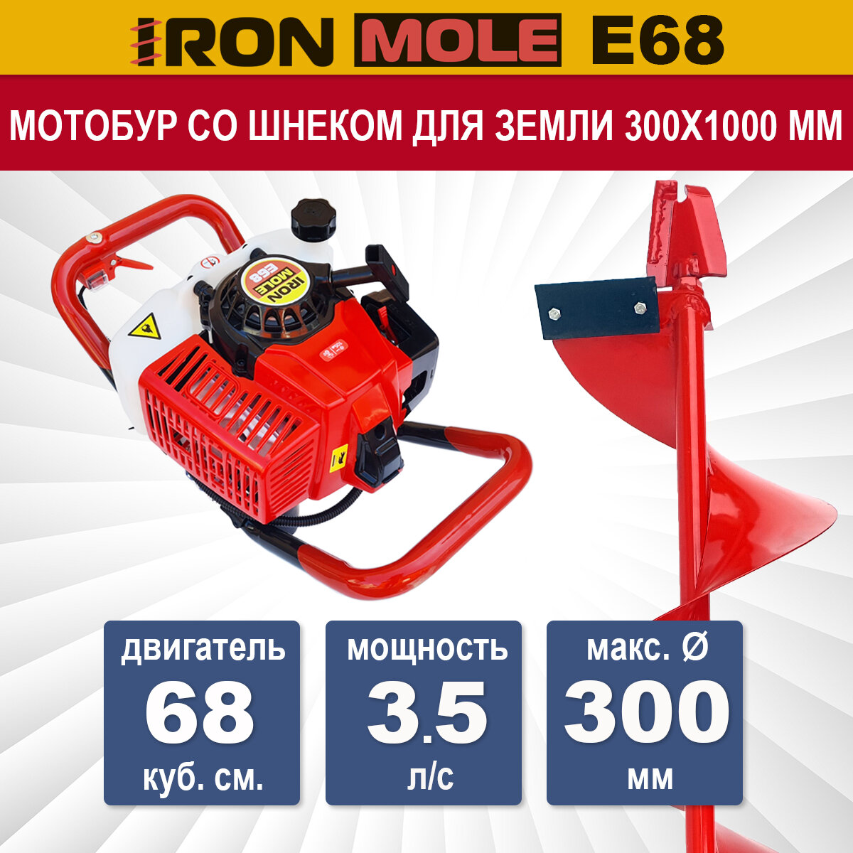 Купить Мотобур Iron Mole E68 с профессиональным шнеком для земли N1 300Х1000 мм