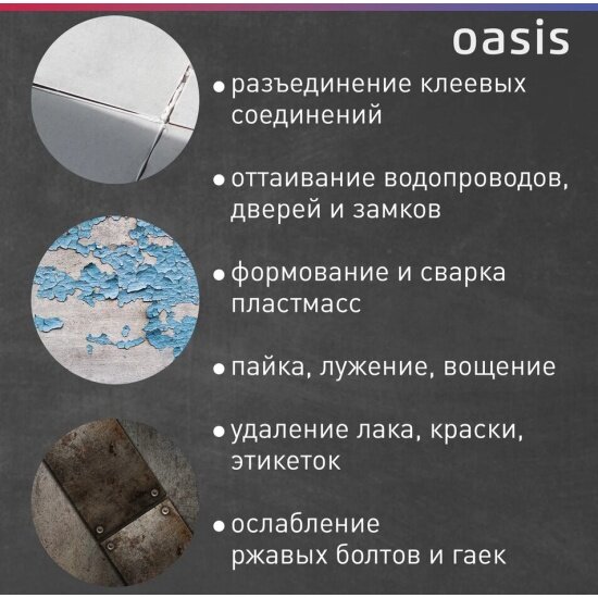 | Назначение | сварка плитки / удаление припоя / удаление краски / разморозка труб / размягчение покрытий / сварка пластика / изоляция проводов / подсушивание краски |