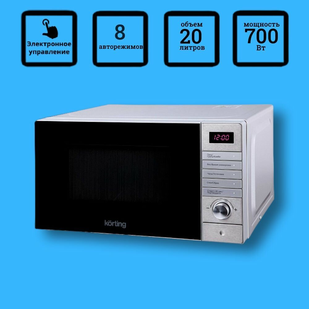 Микроволновые печи Korting/ 25.8х44х35 см, 20 л, 700 Вт, гриль: 1000 Вт, электронное управление, LED дисплей, 8 автопрограмм, нержавеющая сталь