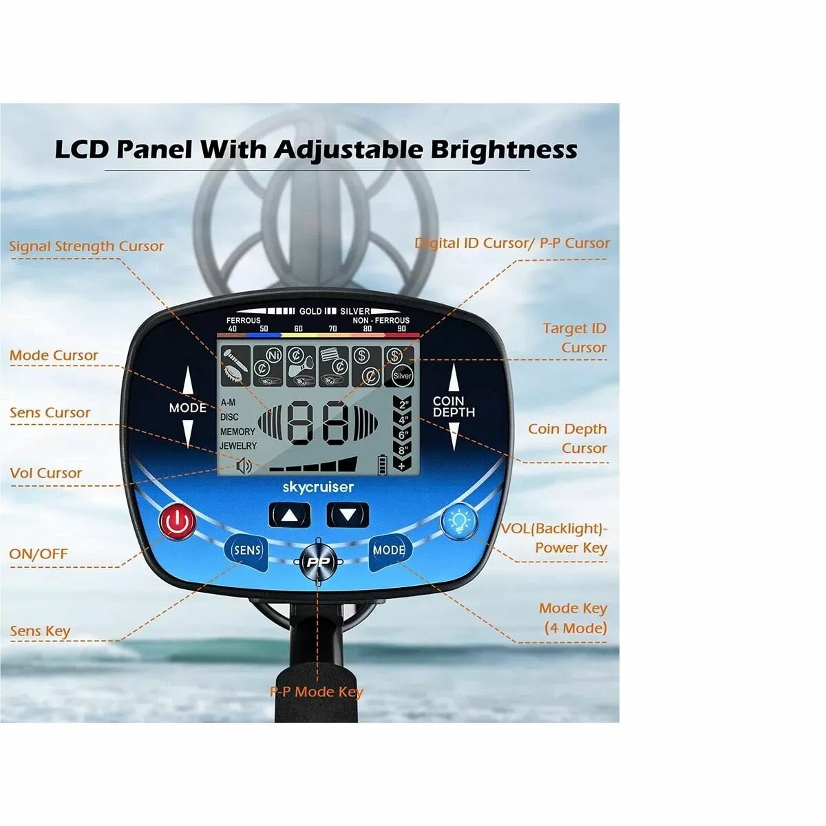 | Особенности | влагозащита катушки/рамки / встроенный динамик / детский / дискриминатор / настройка чувствительности / подлокотник / тональная идентификация |
