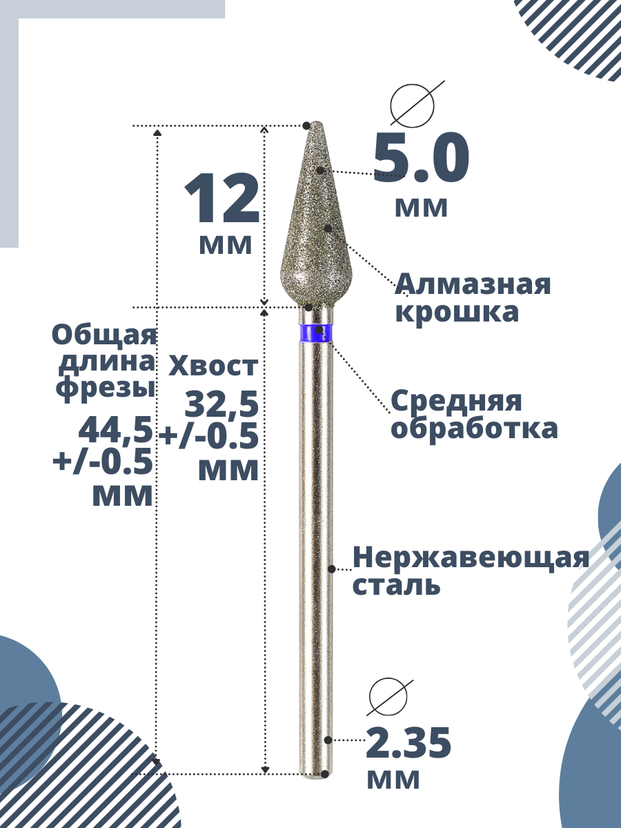 Фреза Astial "Морковка" (Почка Конус Капля) для маникюра и педикюра алмазная, 5 мм, синяя насечка , 10 штук