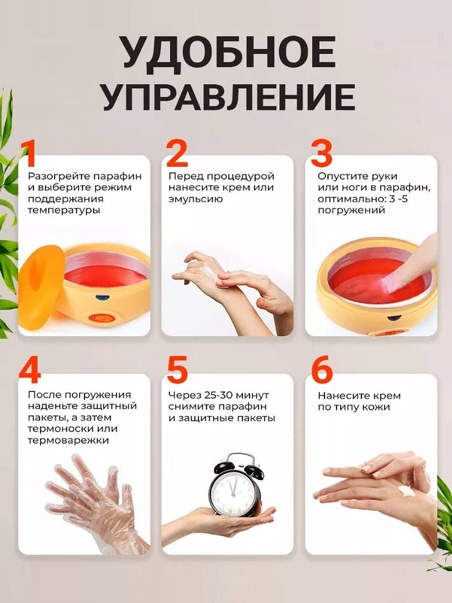 | Способ применения | Руки или ступни погрузить в парафиновую ванну с расплавленным парафином 5-7 раз. Затем надеть махровые варежки для парафина, варежки для парафинотерапии или электроварежки/носки для парафина. Через 15 минут снять варежки. Рекомендуется нанести небольшое количество питательного крема на кожу перед проведением. |