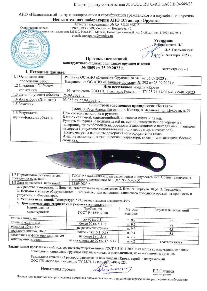 Нож "Крот",ООО "ПП "кизляр"