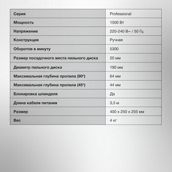 | Плюсы: | 5300 оборотов в минуту, ручная конструкция, диск 19 см, 1500 вт мощность. |