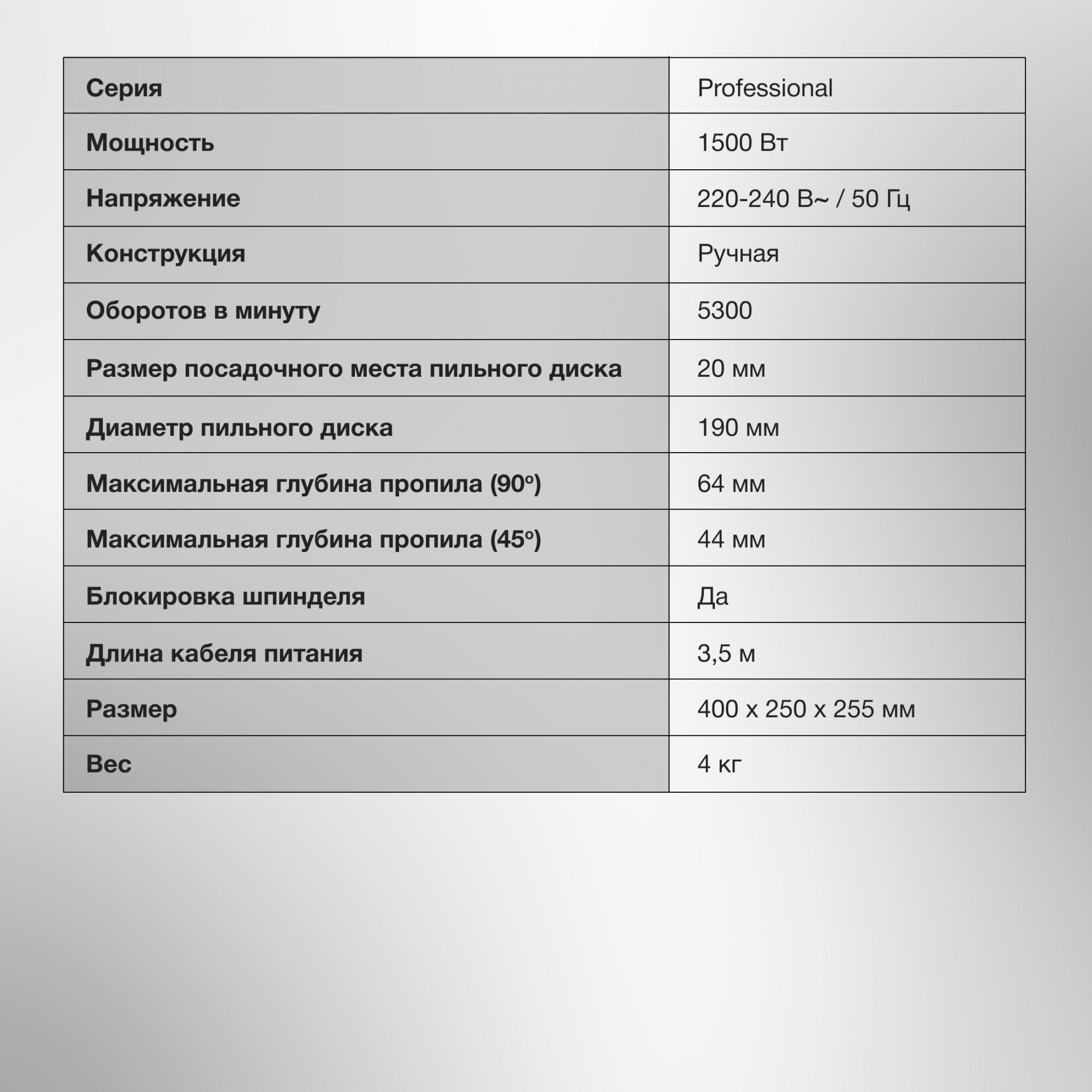 | Глубина пропила (45°) | 44 мм |