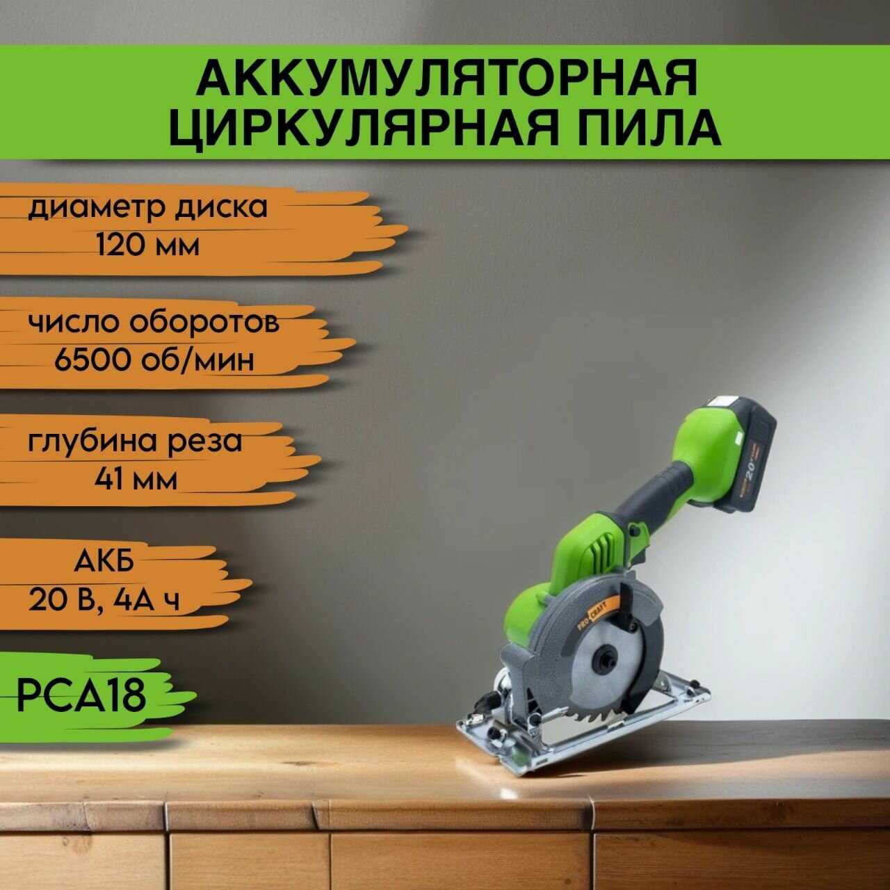 Пила циркулярная дисковая аккумуляторная Procraft PCA-18 (1 АКБ и ЗУ), диск 120мм, пропил 41мм, 6500об/мин