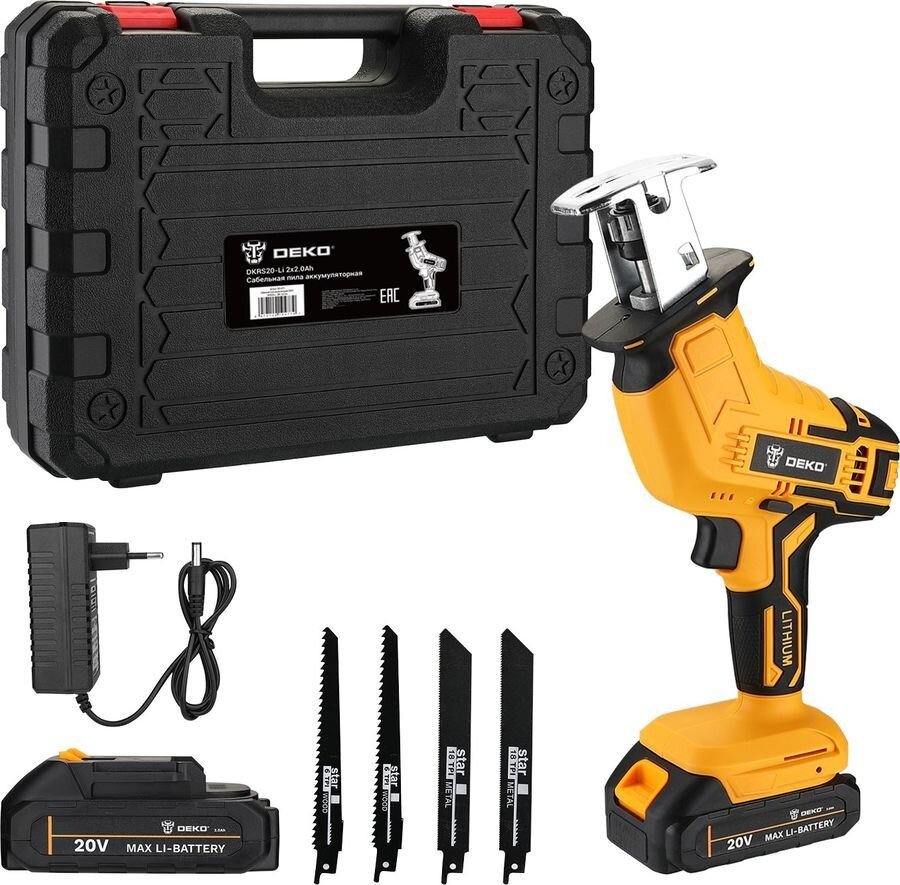 Пила сабельная аккумуляторная DEKO DKRS20-Li, 20 В, 2 Ач,2600 об/мин, ход 15 мм