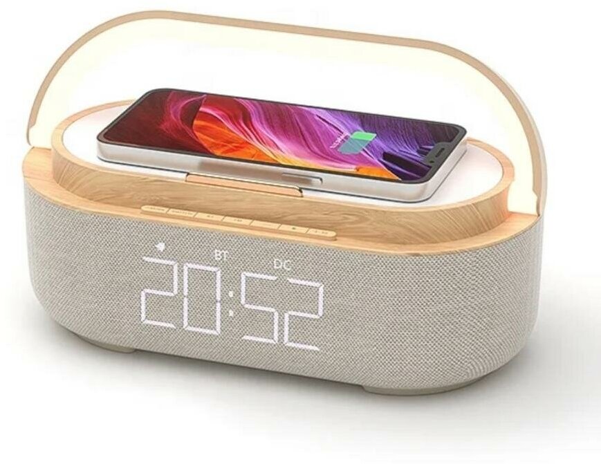 | Плюсы: | Красивый дизайн, устройство 4 в 1(часы, ночник, колонка, беспроводная зарядка)