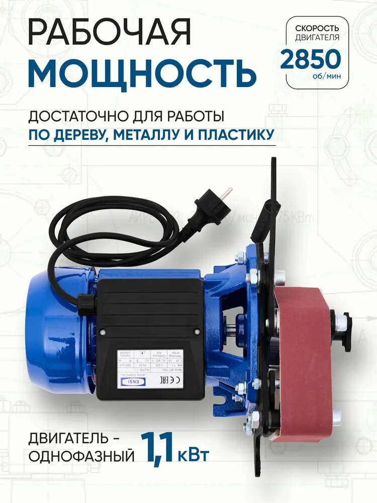 | Особенности конструкции | Защитный кожух, Поворотное основание/рабочий стол, Регулируемый ограничитель, Стационарная установка, Шлифовальная лента |