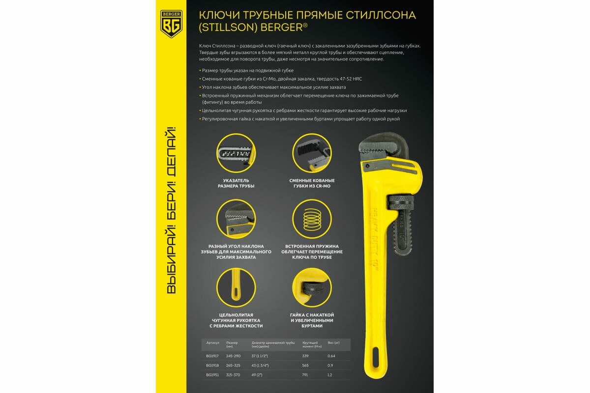 Ниже Вы можете прочитать отзывы на Ключ трубный прямой Stillson, 245-290 мм, 1 1/2 BERGER Stillson BG1917, ознакомится с подробными характеристиками, посмотреть интересные обзоры и фотографии на Ключ трубный прямой Stillson, 245-290 мм, 1 1/2 BERGER Stillson BG1917.