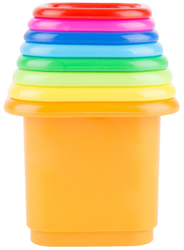 | Плюсы: | Хорошая пирамидка. На донышках каждого стаканчика разные дырочки (для воды) и разные формы рисунков (круг, ромб и др. чтобы оставлять рисунок на песке).