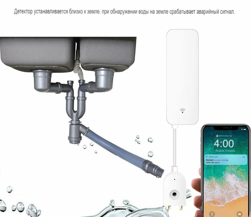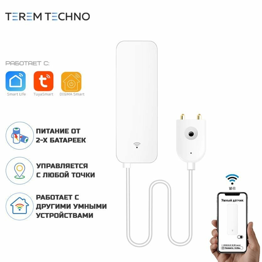 Умный беспроводной WiFi датчик протечки воды Terem Тechno дистанционное управление от Tuya / Smart Life / Digma для умного дома белый интересное: