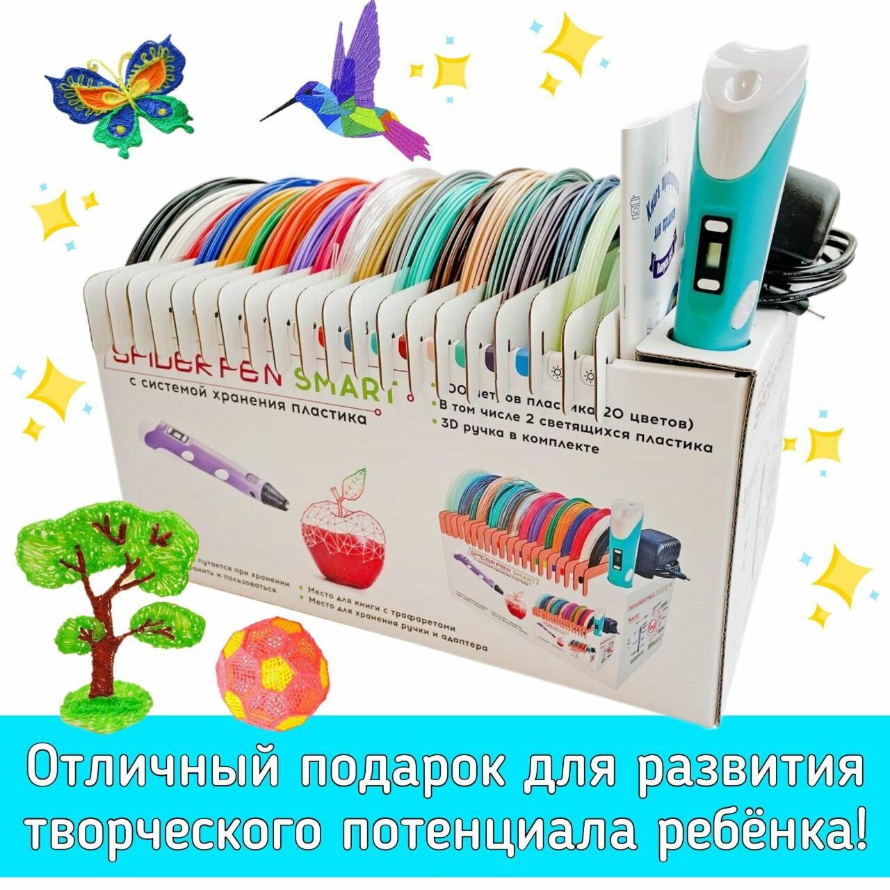 3D ручка SPIDER PEN BLUE "10 ИГР", (Книга Трафаретов + 20 цветов пластика с системой хранения)