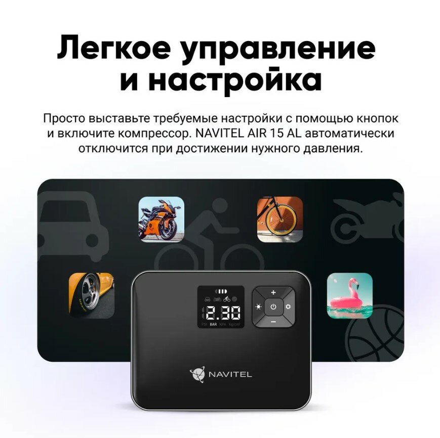 | Подробная комплектация | NAVITEL AIR 15 AL; Кабель USB-C; Воздушный шланг; Адаптер сопла (4 шт.); Чехол для хранения; Руководство пользователя; Гарантийный талон |