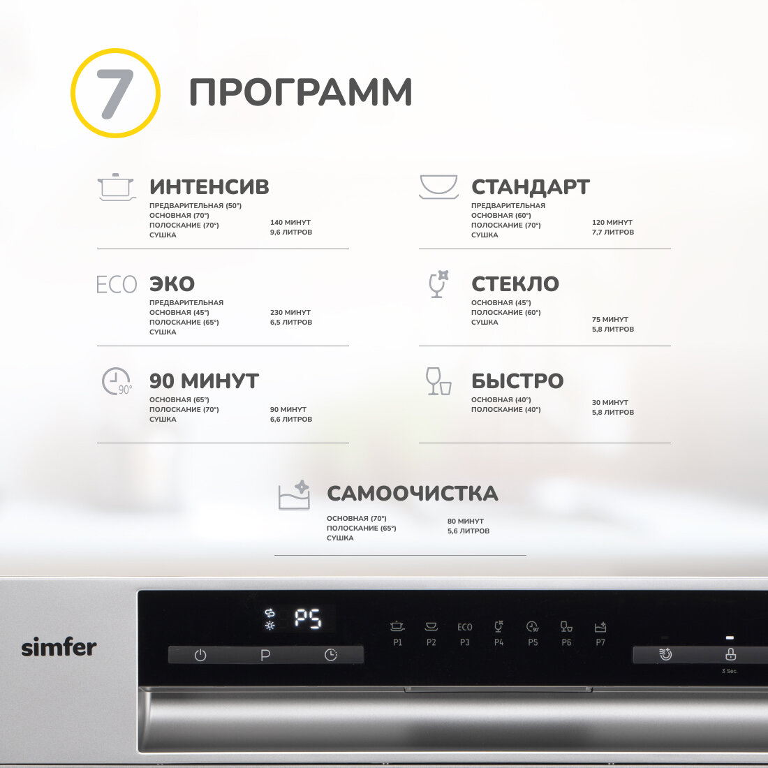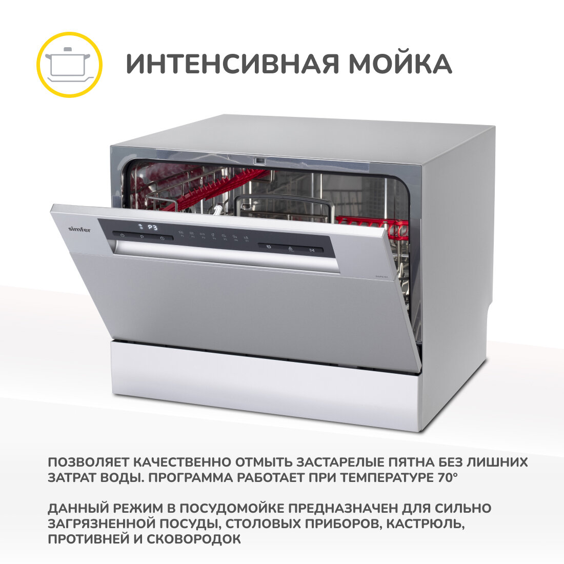 Настольная посудомоечная машина Simfer , 6 комплектов , 7 программ , отсрочка старта , блокировка от детей