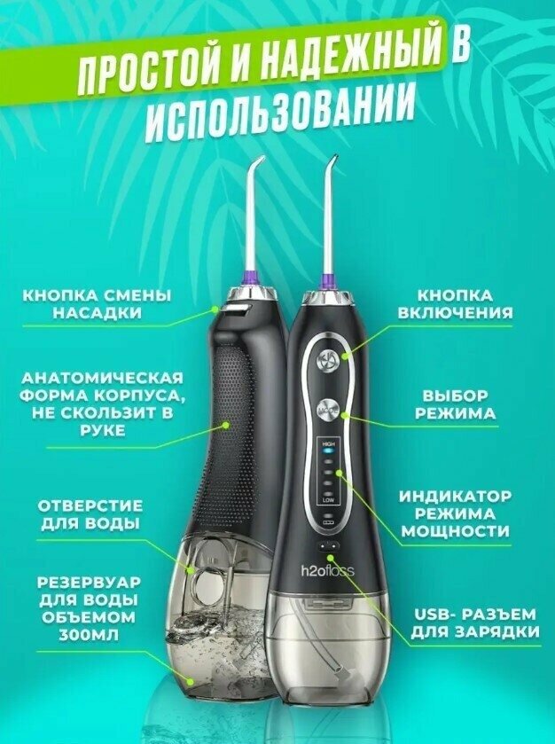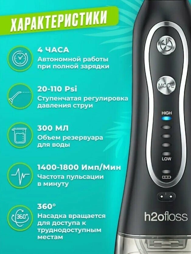 Портативный ирригатор IPX7 H2Ofloss для очистки полости рта с 8 сменными насадками для чистки зубов и брекетов черный