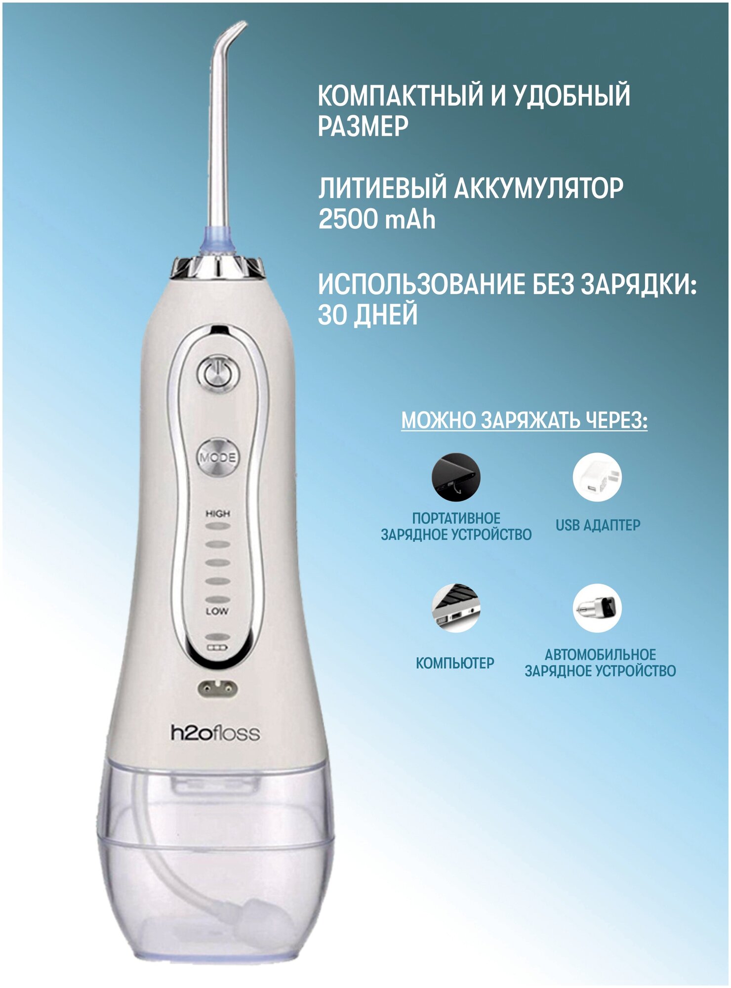 Ирригатор для очистки полости рта с чашей на 300мл и 5-уровневым регулируемым напором воды (белый) интересное: