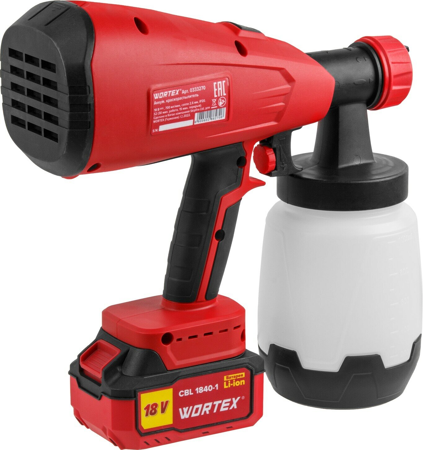 Краскораспылитель аккумуляторный WORTEX 18 В, АКБ и ЗУ., бак 1 л