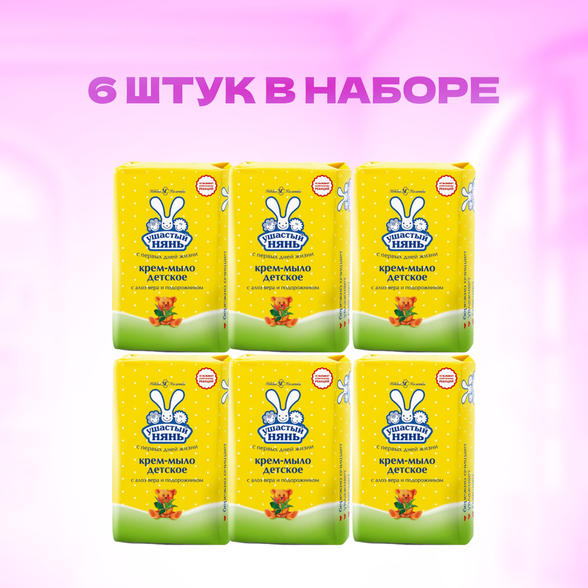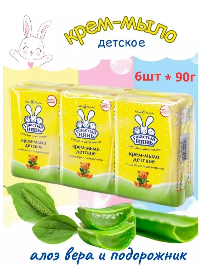Детское крем-мыло Ушастый нянь, Алоэ и подорожник, гипоаллергенное, набор 6 шт. по 90 г.