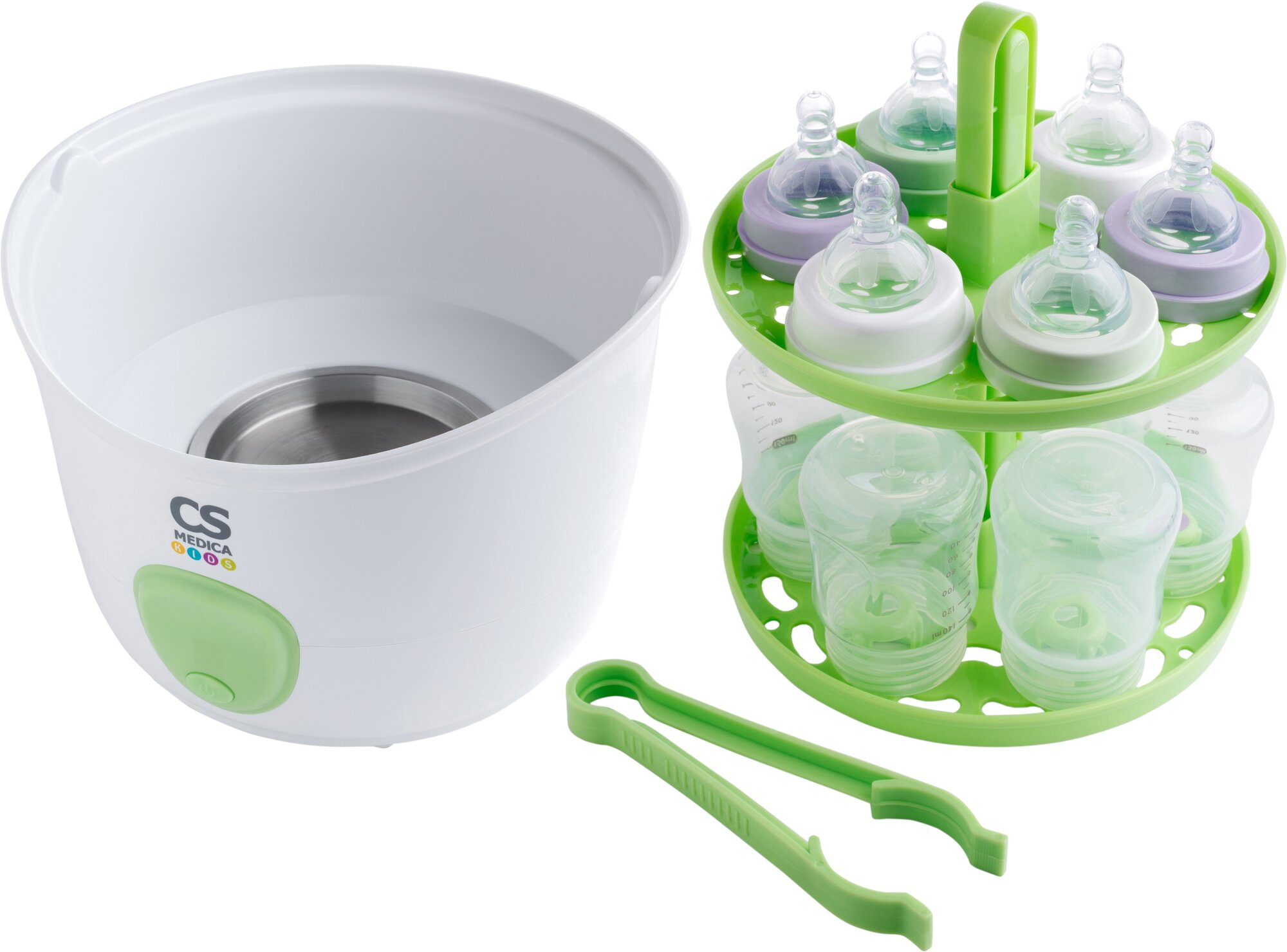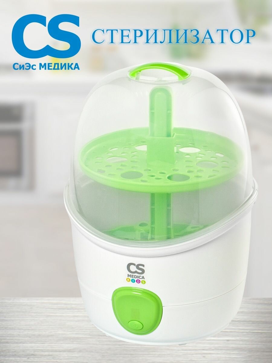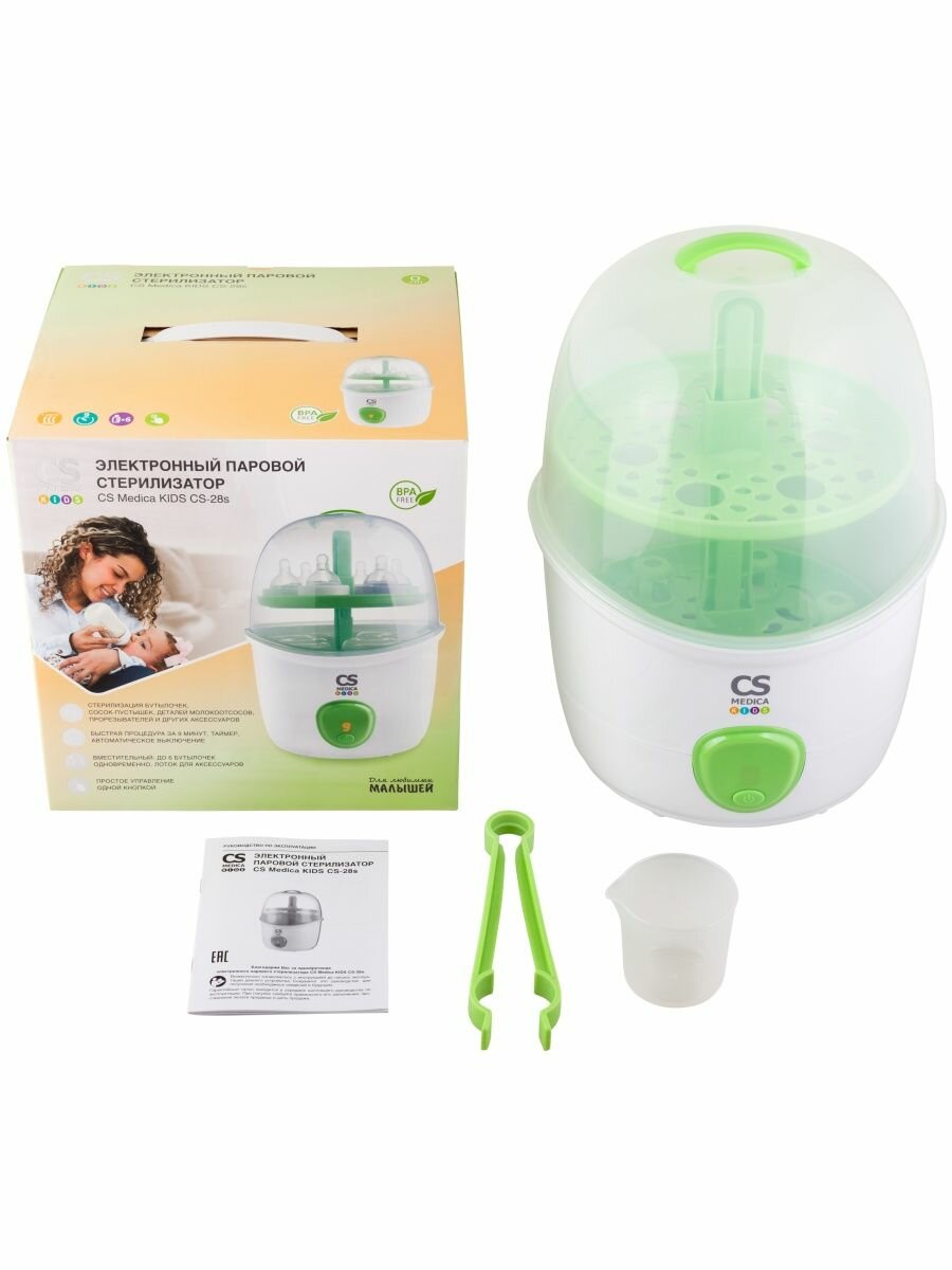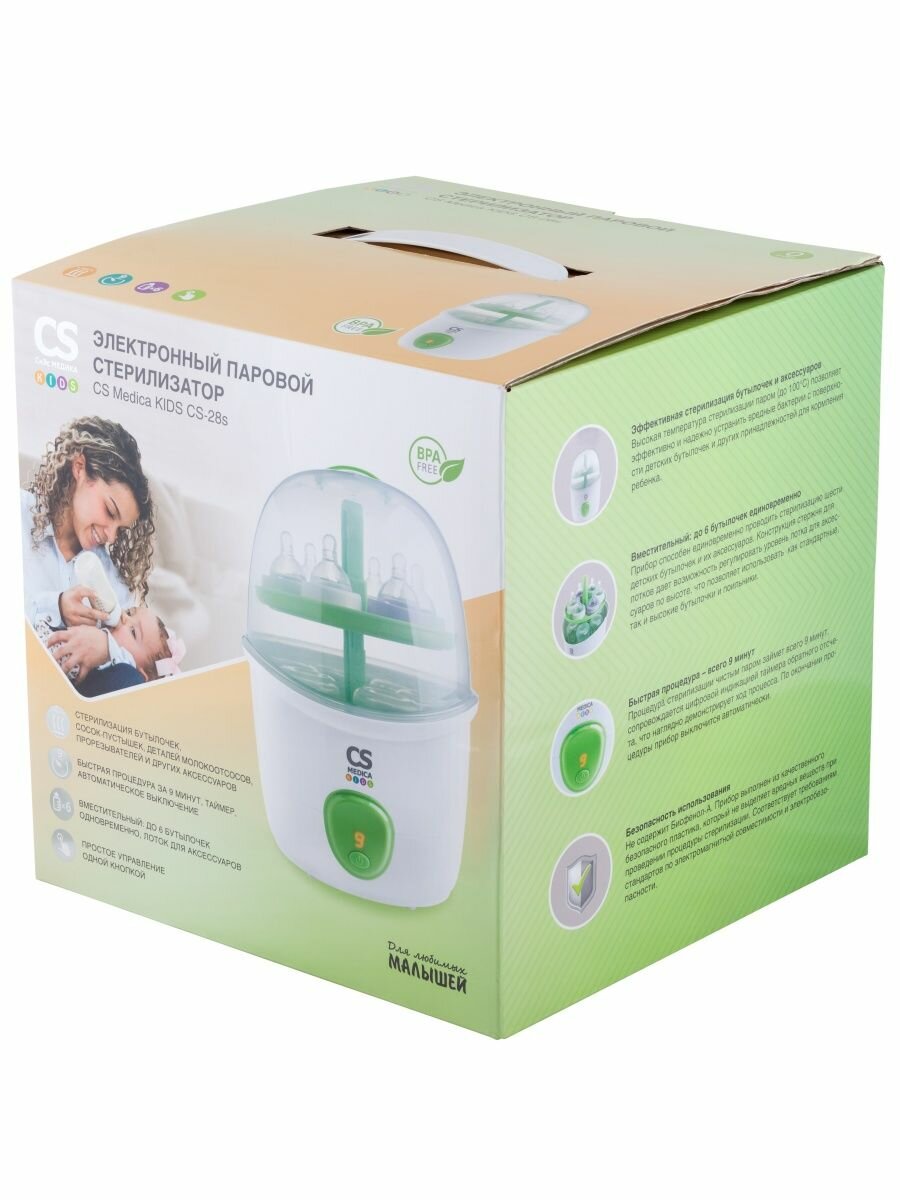Это не первый продукт производителя CS Medica, который мы купили. Поэтому при выборе стерилизатора, не было сомнений в его качестве. И действительно, очень удобный и надежный прибор, изготовленный из безопасного пластика, не содержит Бисфенол-А. При нагревании пластик не выделяет вредных веществ и не имеет запаха. Процедура стерилизации быстрая всего 9 минут. На таймере отображается обратный отсчет. Включается стерилизатор очень просто – нажатием одной кнопки, выключается – автоматически. Одновременно вмещается до 6 бутылочек. В комплекте еще имеются щипцы и мерный стакан. Бутылочки, соски, крышечки стерилизуется паром, при этом устраняются вредные бактерии. Также можно регулировать уровень лотка для аксессуаров. Это дает возможность стерилизовать бутылочки и стандартные, и высокие, а также поильники. Стерилизатором пользуемся полгода. Никаких нареканий к работе прибора не выявили. Рекомендуем к покупке.