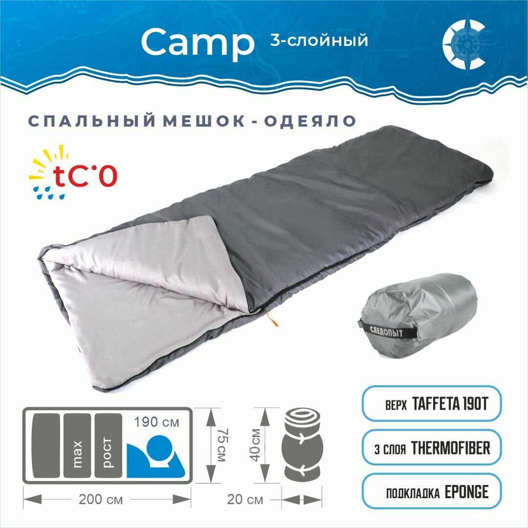 Спальный мешок туристический "следопыт - Camp", 200х75 см., до 0С, 3х слойный, цв.темно-серый / Спальник туристический / Одеяло туристическое / Мешок-одеяло