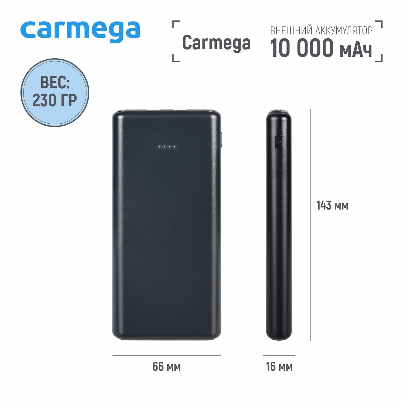 | Комплектация | Внешний аккумулятор CARMEGA Charge 10 10000 мАч Black |