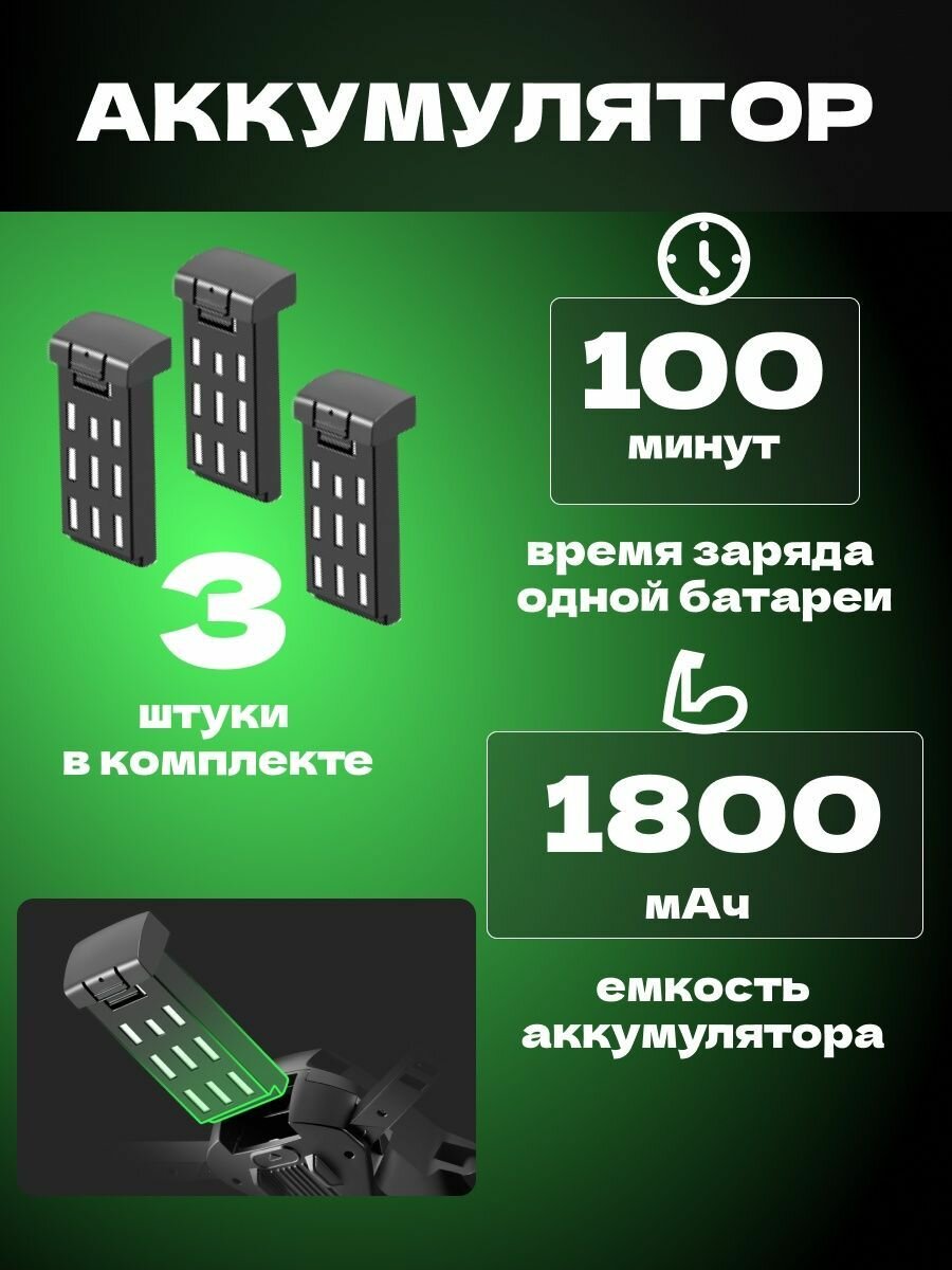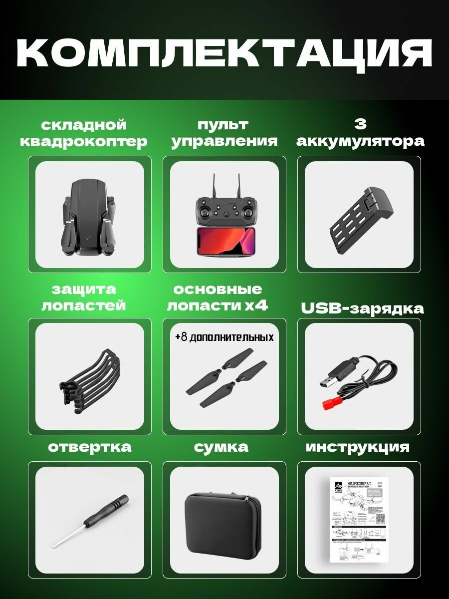 | Комплектация | Складной квадрокоптер, пульт управления, 3 аккумулятора, защита лопастей, основные лопасти 4+8, USB-зарядка, отвертка, сумка, инструкция |