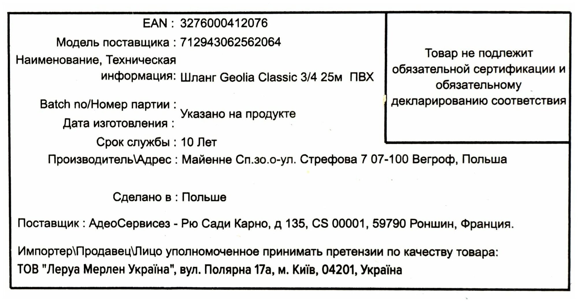 | Дополнительная информация | Шланг для полива Geolia Classic ø19 мм 25 м, ПВХ |