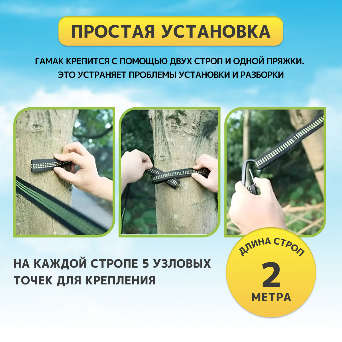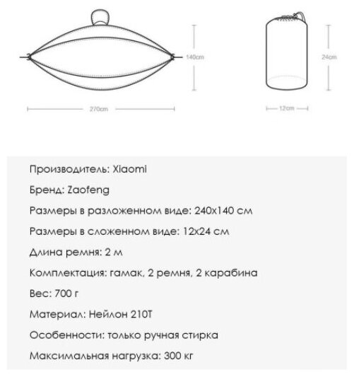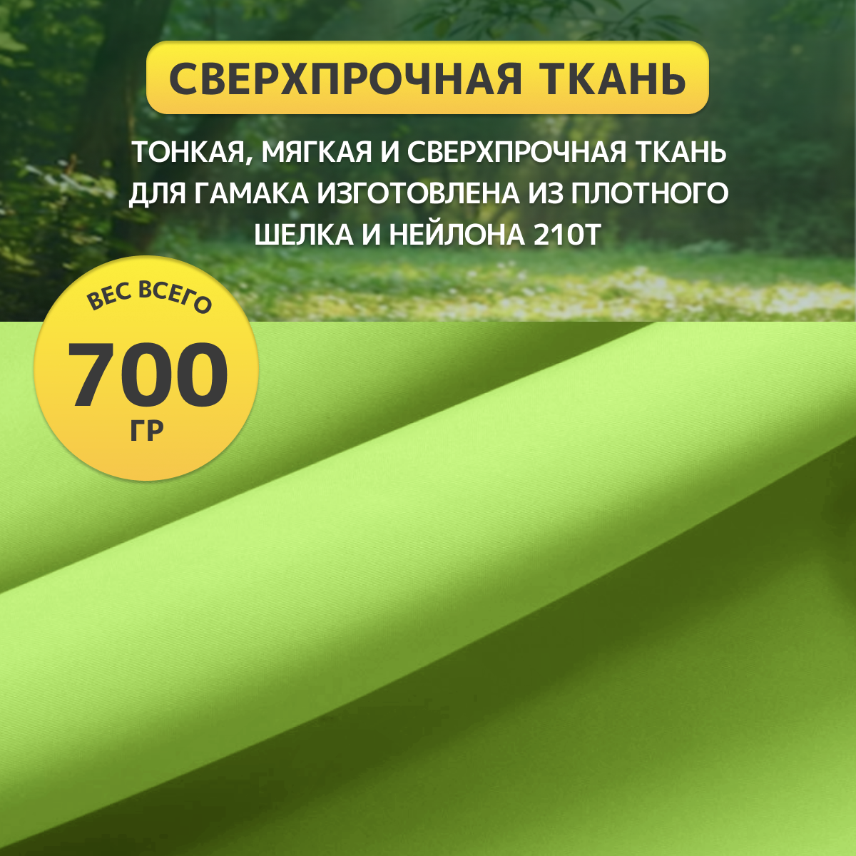 | Дополнительная информация | Для изготовления гамаков используют прочную парашютную ткань (плотный нейлон), который также часто применяют в спецодежде и снаряжении для экстремальных видов спорта. Для подвешивания гамака используется особо прочная стропа из полипропиленовых волокон. |