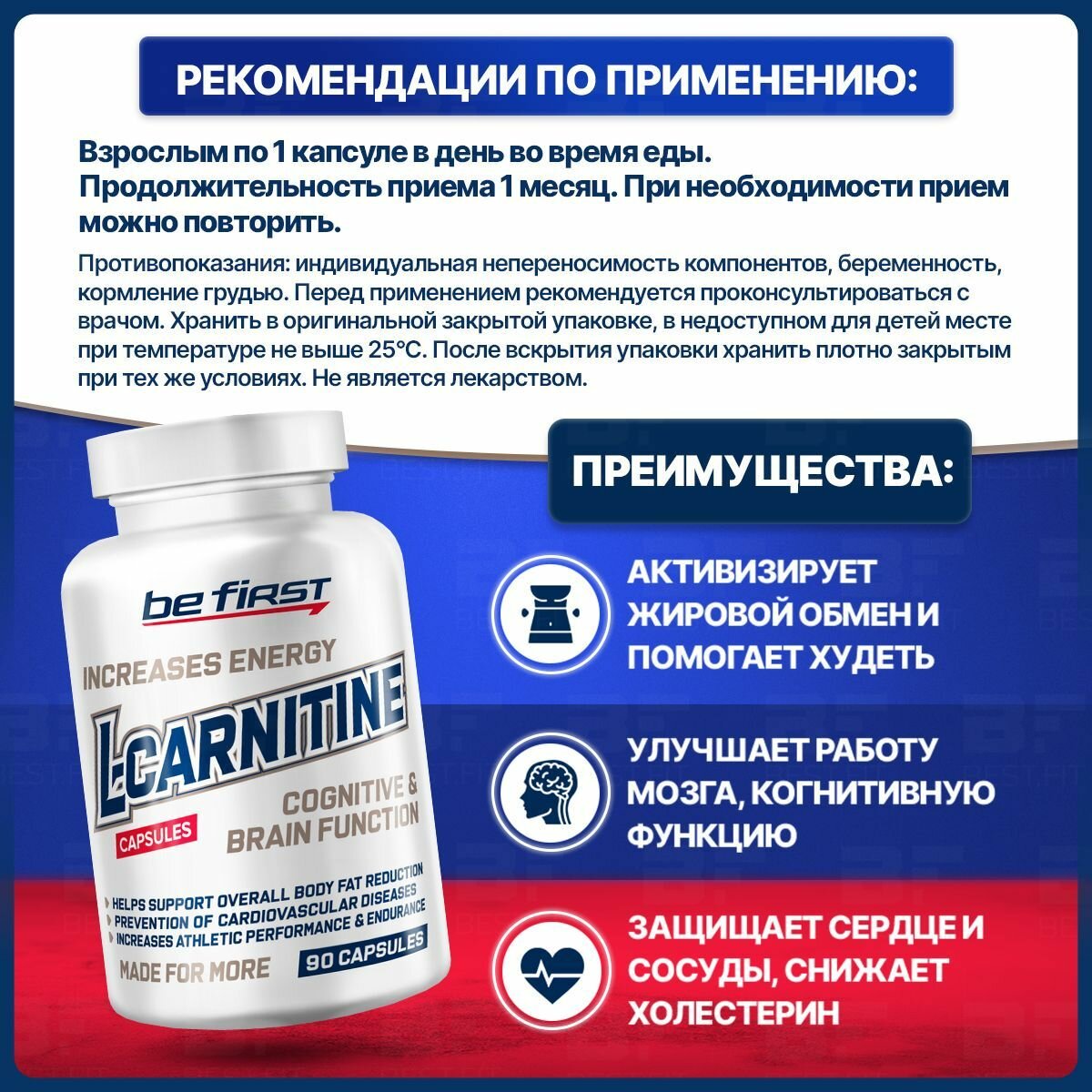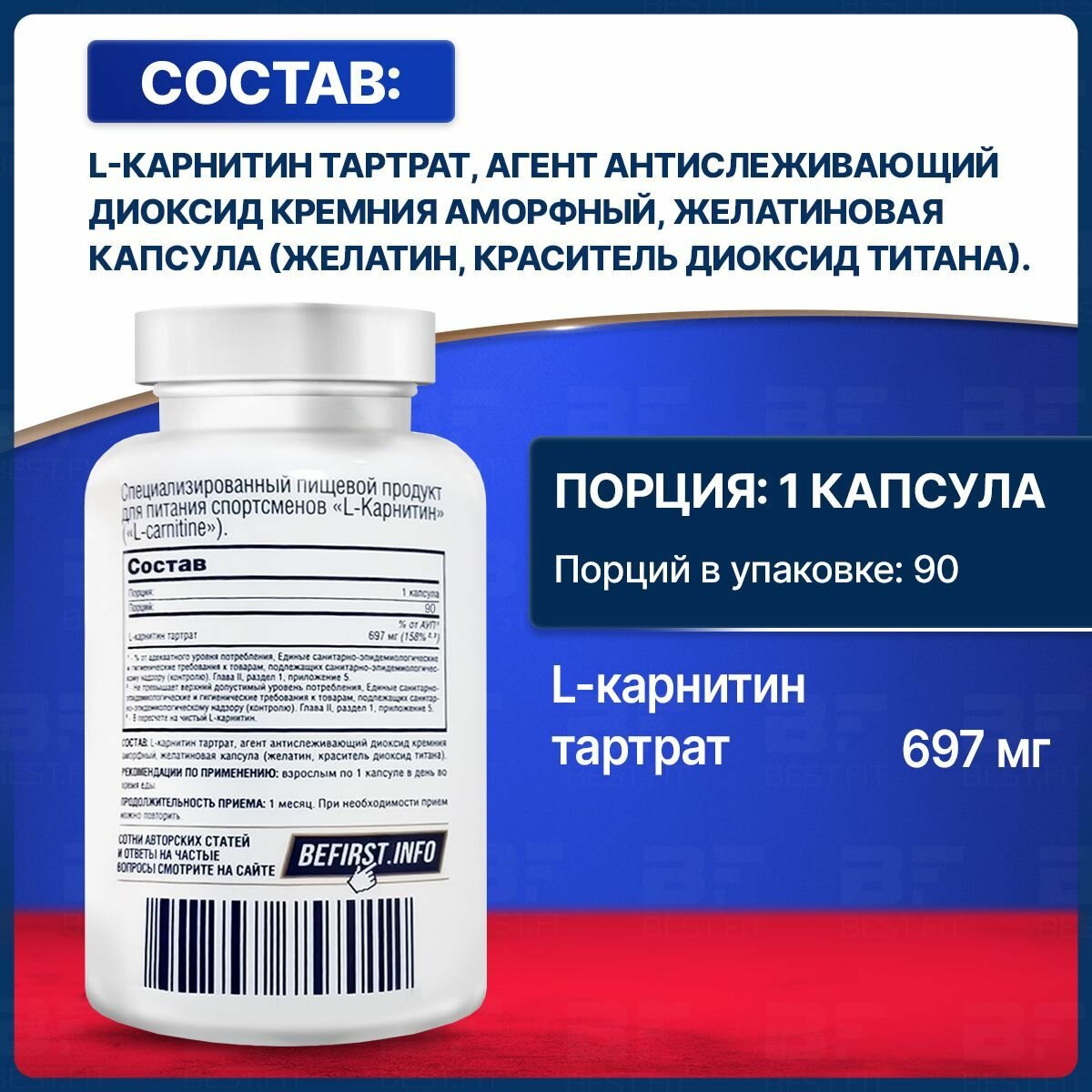 L-карнитин 697 мг, 90 капсул / Be First/ Жиросжигатель для похудения женщин и мужчин