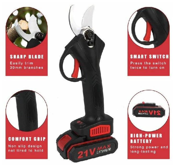 Аккумуляторный садовый секатор 21V (1.5Ah, 2 акб(Li-Ion), +кейс, черный) "BEEZMOTO" интересное: