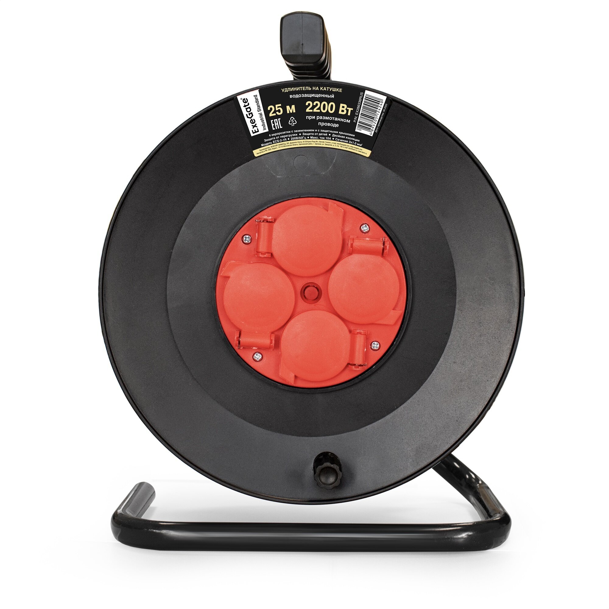 Удлинитель на катушке ExeGate industrial ECS-2-1R (4 евророзетки с заземлением и с защитными крышками, IP44, 25м, защита от детей, защита от перегрузки, 3х1,0мм2, 10А/2.2кВт, Color Box)