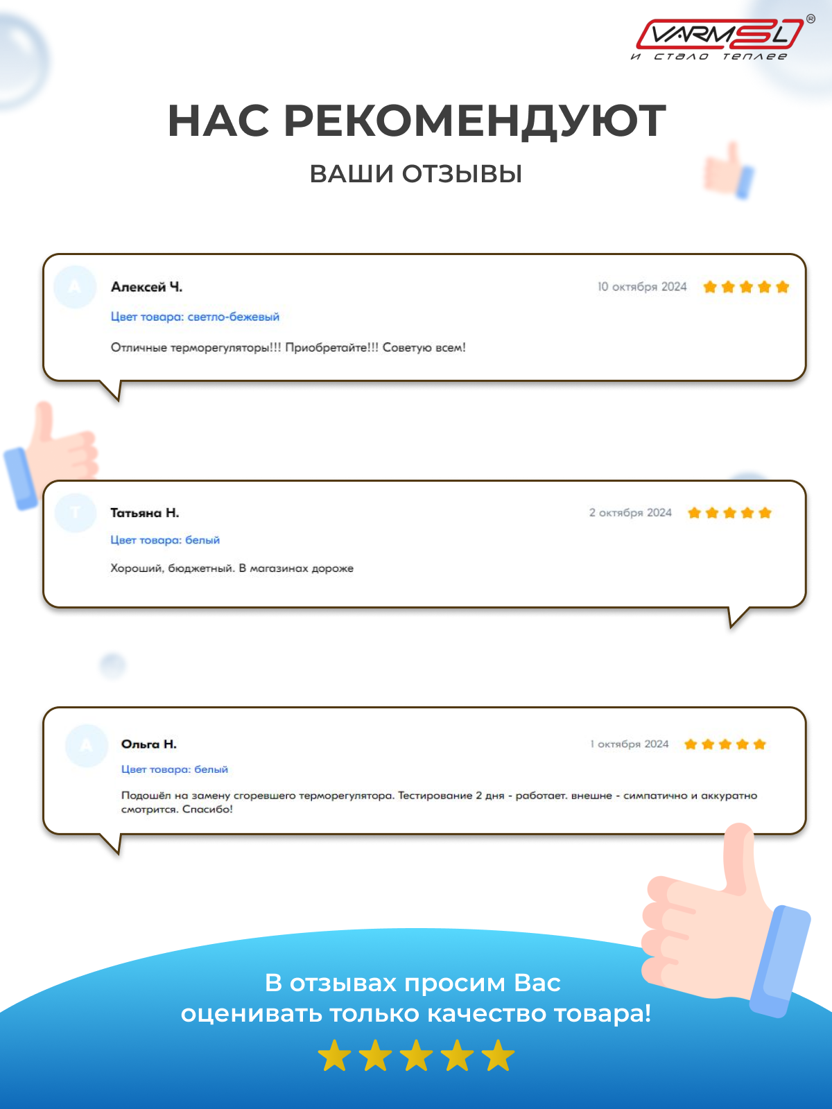 Ниже Вы можете прочитать отзывы на Терморегулятор Varmel RTC 70.26 механический/слоновая кость, ознакомится с подробными характеристиками, посмотреть интересные обзоры и фотографии на Терморегулятор Varmel RTC 70.26 механический/слоновая кость.
