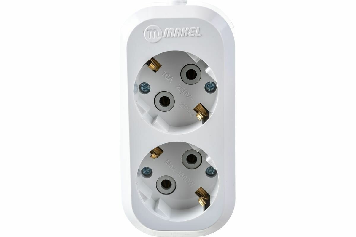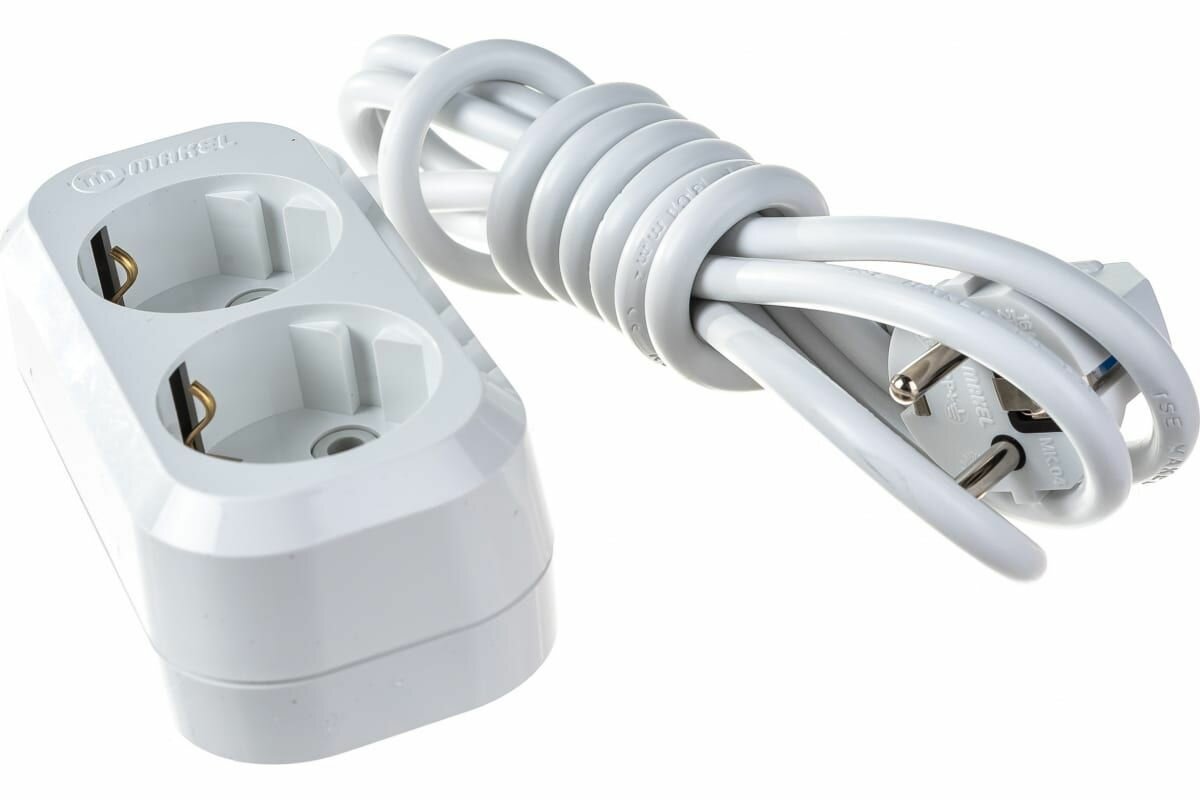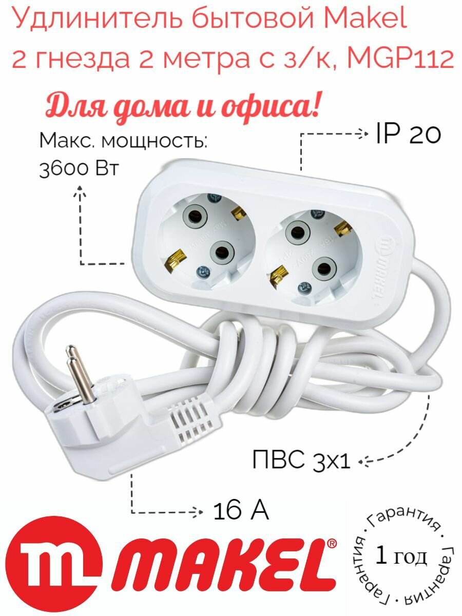 Удлинитель Makel длина 2 м метра розетки 2 гнезда с заземлением c/з Макел 3х1 ПВС электрический сетевой бытовой 3600 вт 220в белый, арт. MGP112