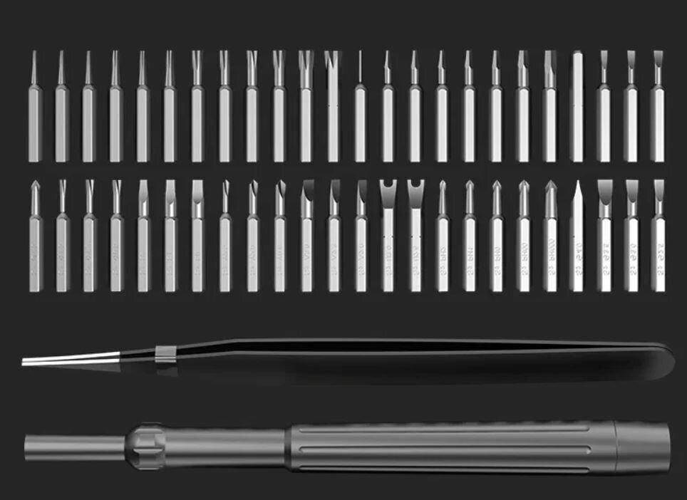 Магнит слабоват. Биты как будто собрали из разных наборов, где-то надо налево повернуть биты чтобы прочитать, где-то направо. Не совсем удобно. Пинцет кривой. |