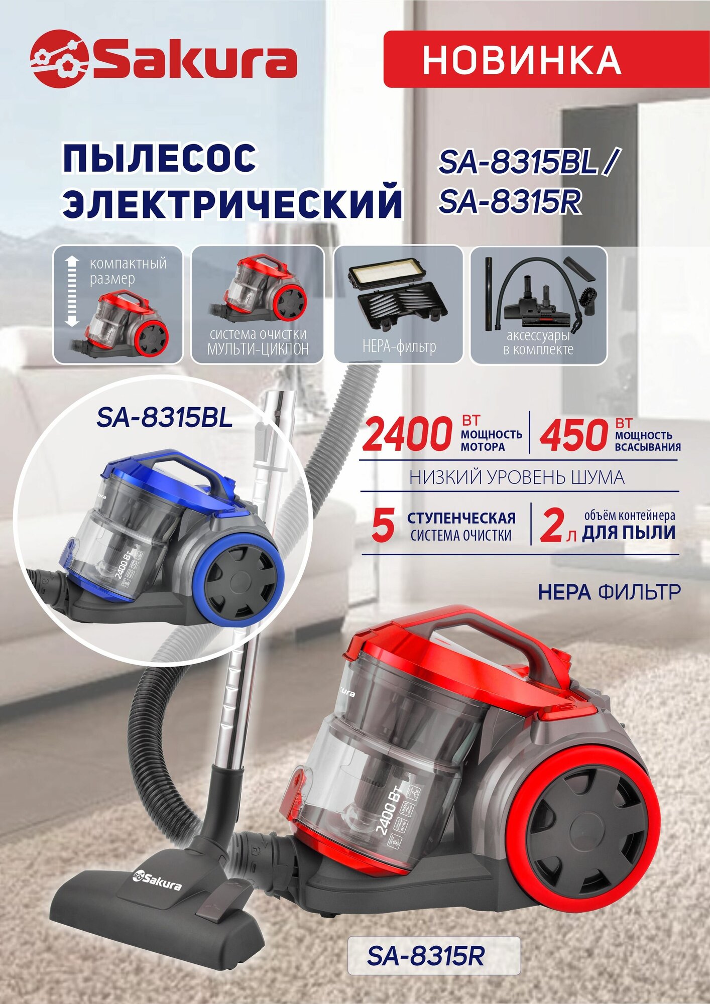 SAKURA Пылесос Sakura SA-8314R, 2400/450 Вт, HEPA-фильтр, 2 л, красный