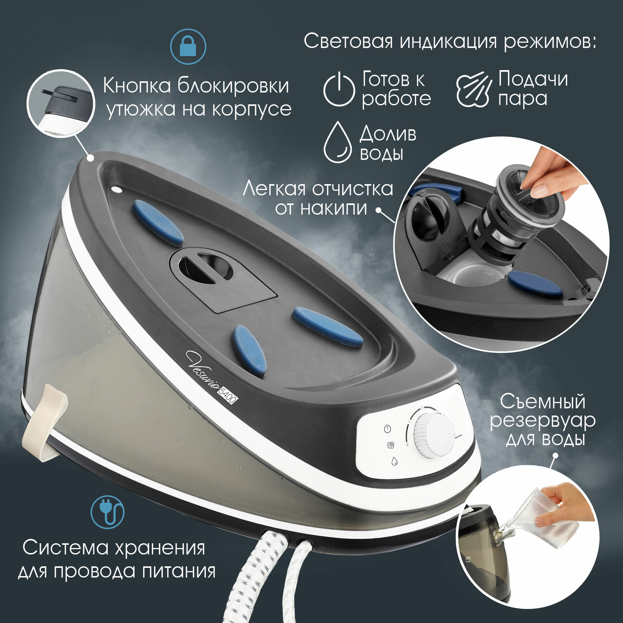 Утюг с парогенератором для одежды VLK Vesuvio-5400 / паровой удар до 350 г/мин / вертикальное отпаривание интересное: