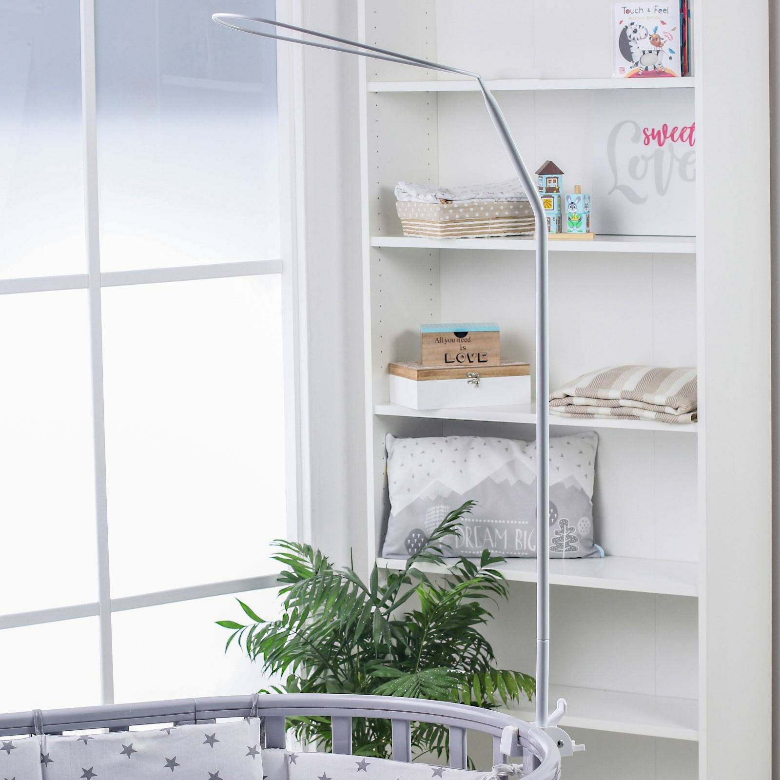 | Плюсы: | Быстро крепится, не царапает кроватку. |