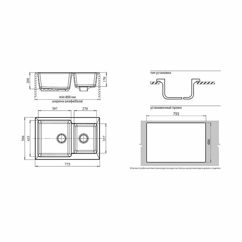 Мойка кухонная GranFest PRACTIK GF-P-780K 2 чаши 780*510 мм графит, мрамор