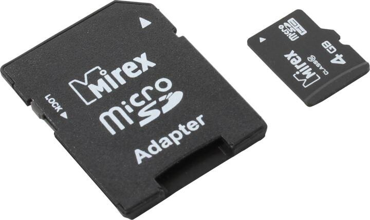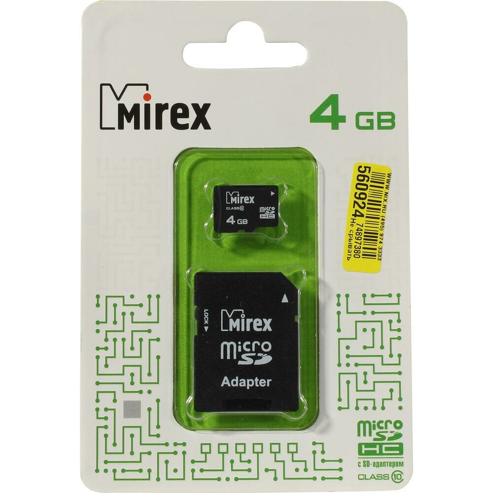 Карта памяти microSDHC MIREX 4 GB (class 10) с адаптером (13613-AD10SD04)