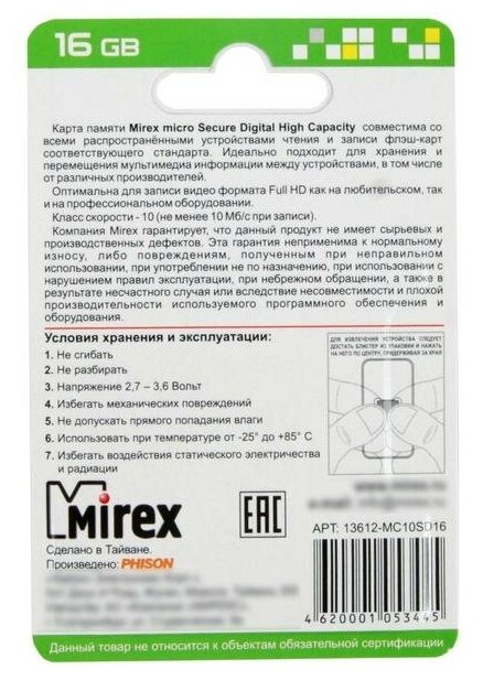 Карта памяти MicroSDHC 16 GB Class10 Mirex