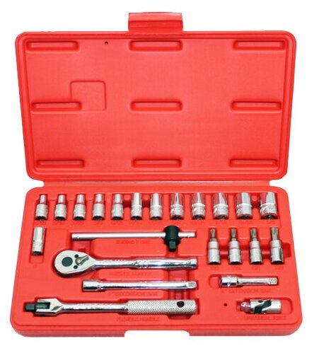 | Головки торцевые подробно | 1/4": 5/32", 3/16", 7/32", 1/4", 9/32", 5/16", 11/32", 3/8", 13/32", 7/16", 15/32", 1/2", 8 мм; с битами 1/4": T20, T25, T30, T40;… удлинитель 1/4": 50, 100 мм; вороток с шарниром 1/4"; трещотка 1/4"; карданный шарнир 1/4" ещёскрыть |
