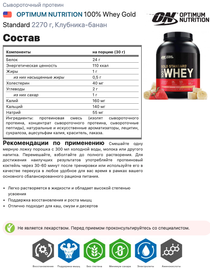 СохранитьПротеин Optimum Nutrition 100% Whey Gold Standard 2270 г, клубника-банан интересное: