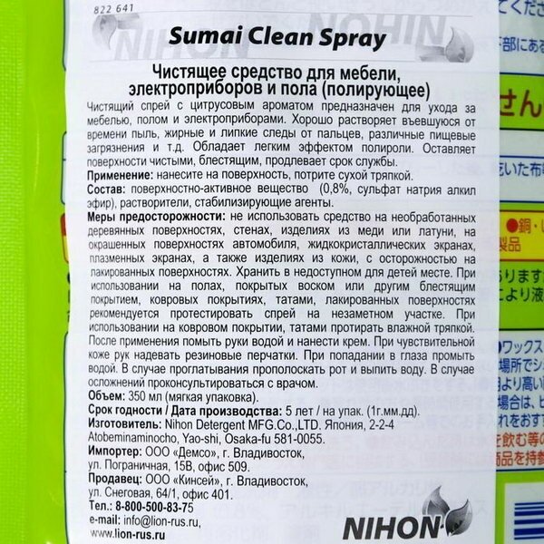 Nihon Чистящее средство для мебели, электроприборов и пола (полирующее) "Sumai Clean Spray" 350 мл