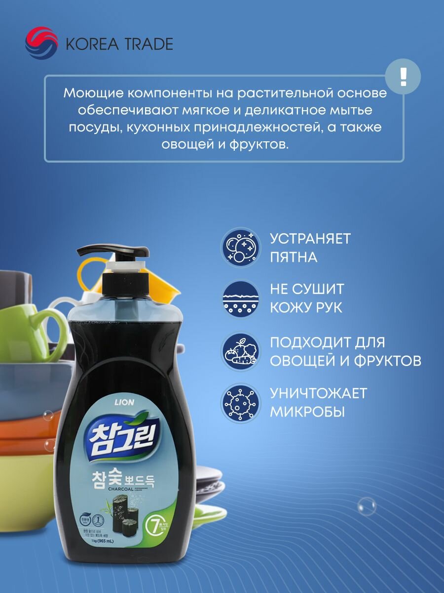 LION Chamgreen Средство для мытья посуды, овощей и фруктов, для детей, бальзам гель для мытья посуды биоразлагаемый эко антибактериальный Древесный уголь, флакон 965 мл