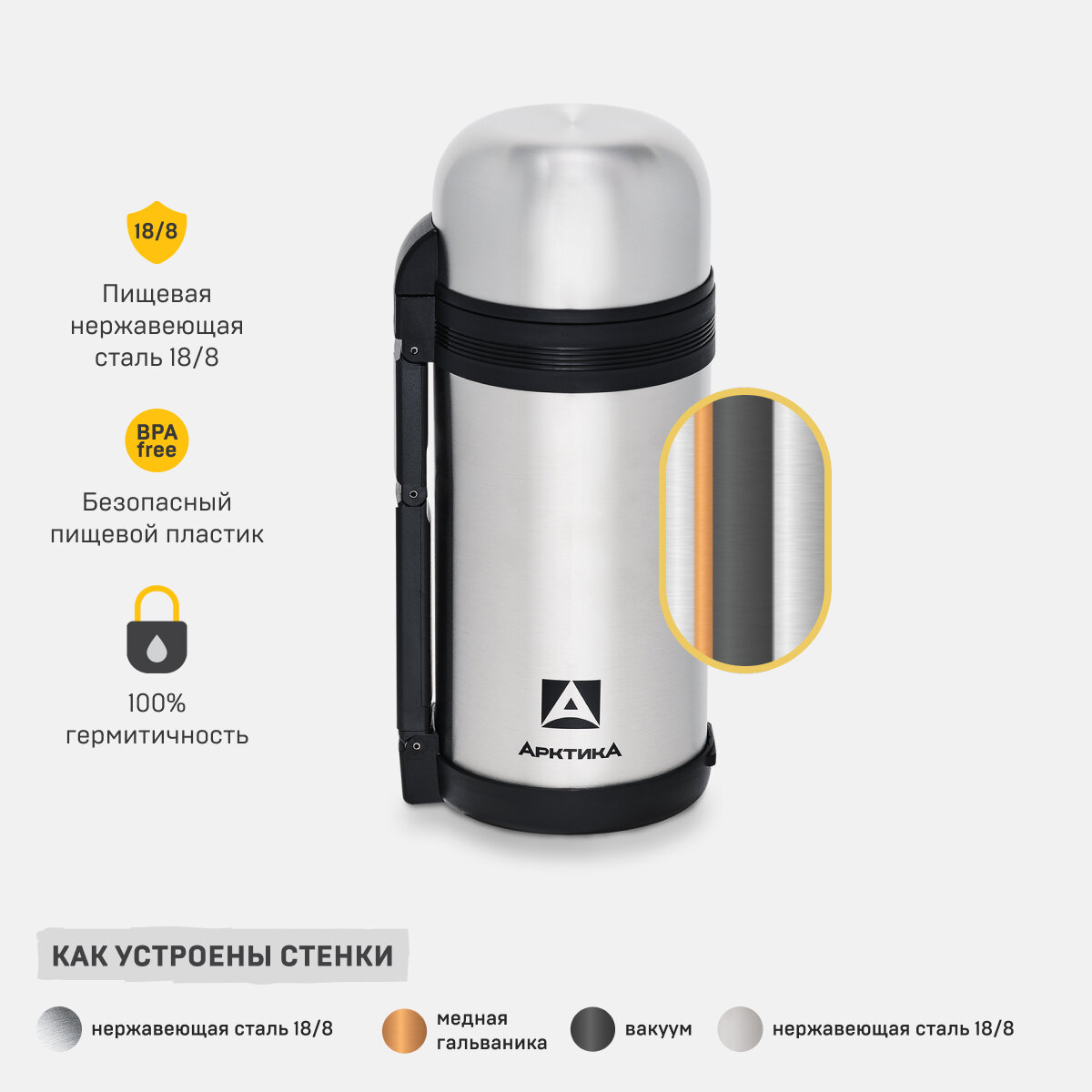 Термос с ручкой для чая и еды Арктика 201-1000 - Объем 1000 мл - Сталь