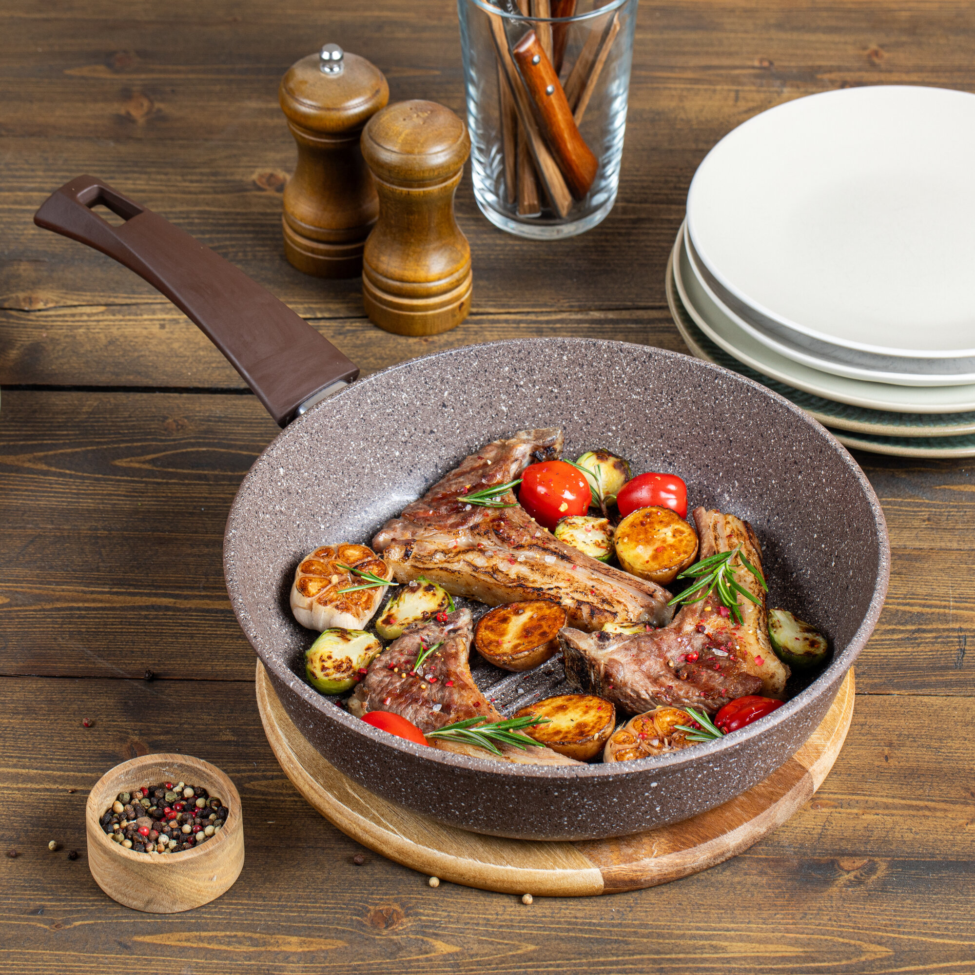 Сковорода VARI BR31124 Pietra коричневый с антипригарным покрытием Quantanium с ручкой soft-touch 24см