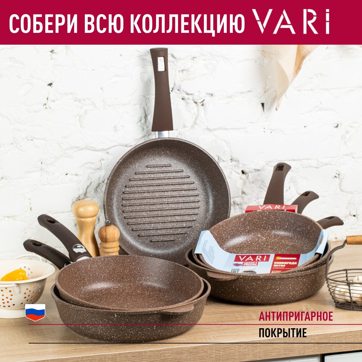 Сковорода VARI BR31122 коричневый Pietra теплый гранит с ручкой soft-touch 22 см
