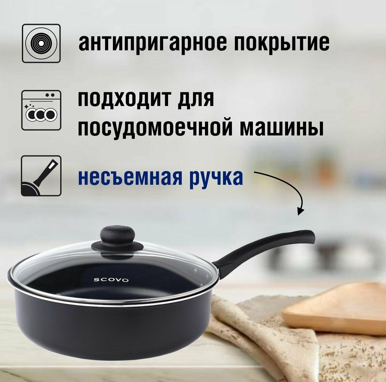 SCOVO Сотейник Consul, 3,7 л, d=26 см, стеклянная крышка, пластиковая ручка, антипригарное покрытие, цвет чёрный