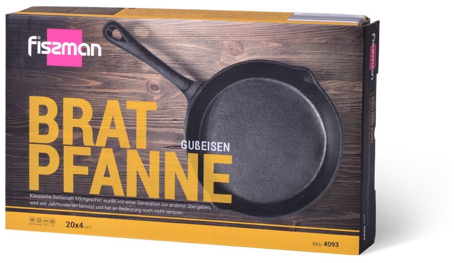4093 FISSMAN Сковорода для жарки 20x4см (чугун) Ручка-чугун; Со сливом; Индукция